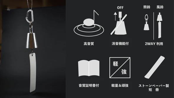 熊の聴覚に届くよう、高周波帯域(3700~3800Hz)で設計された澄んだ音。風に揺れるように軽やかでありながら、70~80dbのしっかりとした音量で山に響き渡ります。